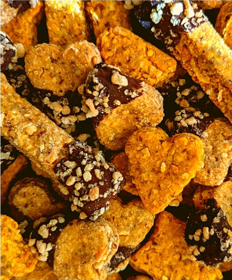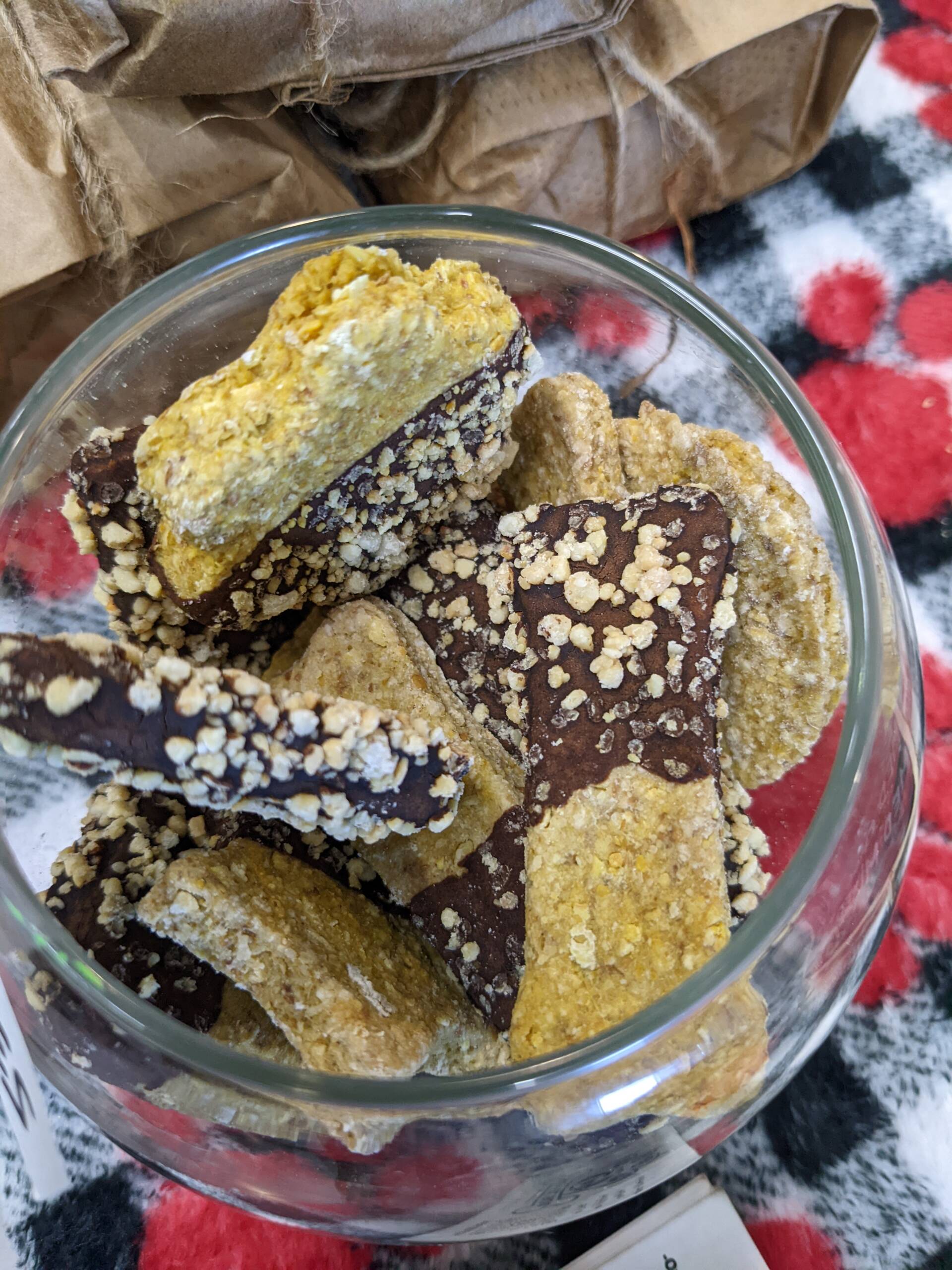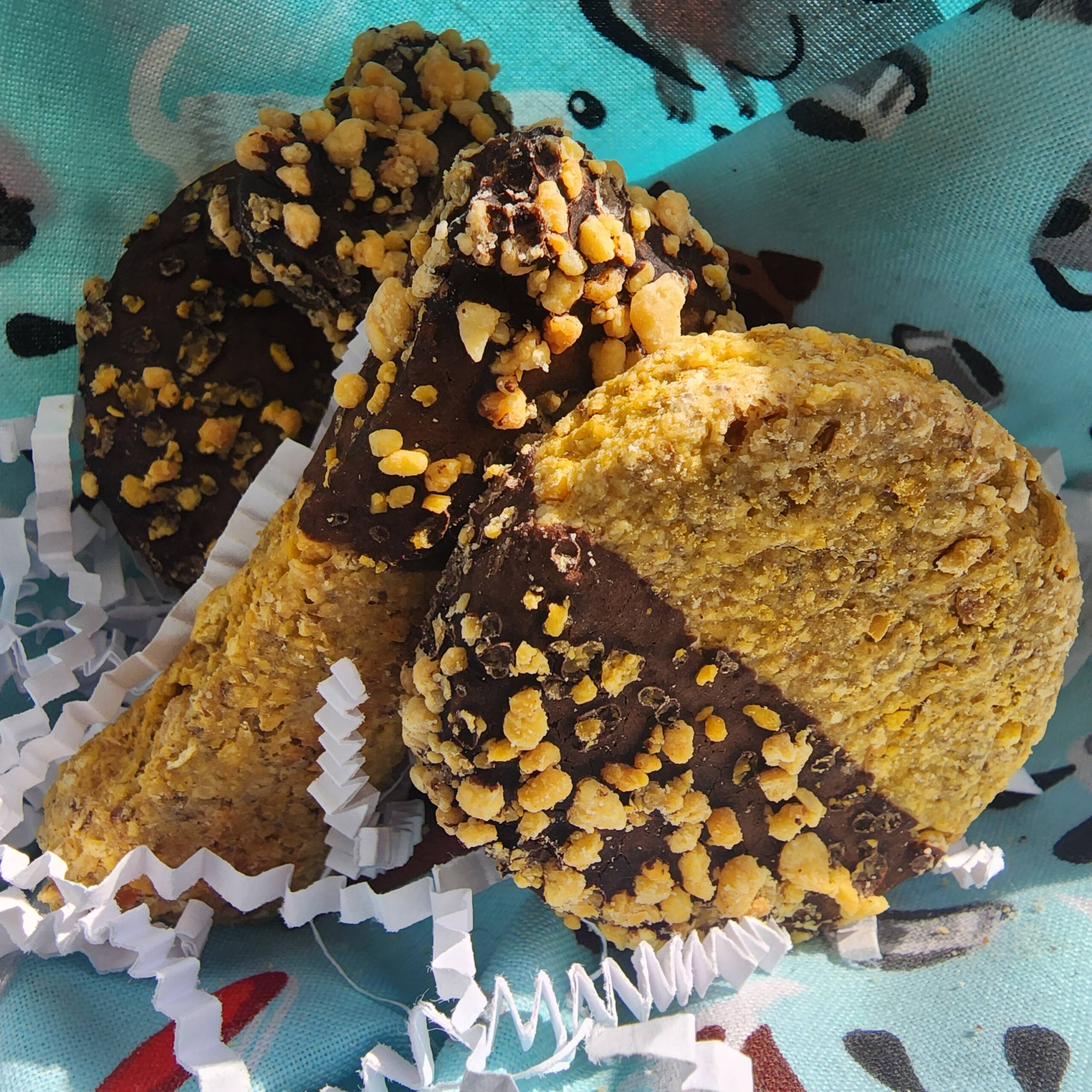 At High 5 Dog Treats, we believe healthy can still be drool-worthy. Our PB Crunch Cookie is a crispy, nutty delight made with just a few organic, plant-based ingredients—like oat flour, sweet potato, peanut butter, maple syrup, and flax seed. The chocolate version adds dog-safe carob for that extra tasty twist!